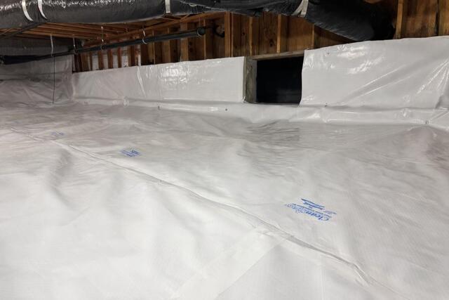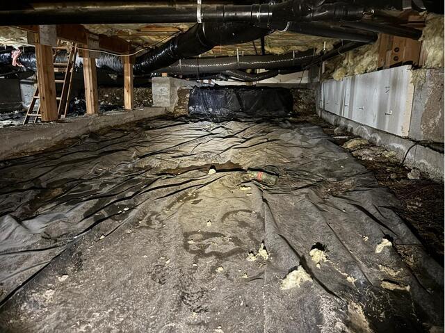 This Reno crawlspace started out with only a thin plastic ground cover (a basic vapor barrier) laid across the dirt floor. While it offers minimal moisture protection, it isn’t sealed or secured like a true encapsulation system, leaving the space vulnerable to humidity, odors, and energy loss.
