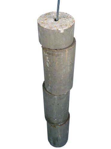 During installation, a small hole is cored through the concrete floor. A slab bracket is assembled beneath the concrete slab, and steel tubes are hydraulically driven down through this bracket assembly.